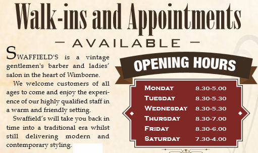 Swaffields Vintage Barbers/Salon Vintage barbers/ladies salon in the Heart of Wimborne offering all aspects of hairdressing 20% OFF any Treatments every time Find Swaffield's Gentlemen's Barber and Ladies' Salon on FaceBook